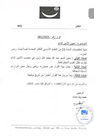 وقال الحزب إن تعيين ولد محمد فال زين يأتي طبقا لمقتضيات المادة 23 من النظام الأساسي للتكتل المحددة لصلاحيات رئيس الحزب.