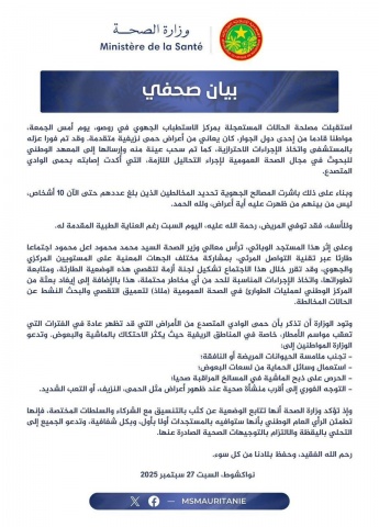 توفي اليوم بمركز الاستطباب الجهوي في روصو مواطن موريتاني بعد إصابته بحمى الوادي المتصدع، فيما أعلنت الوزارة حجز مخالطيه، وتشكيل لجنة أزمة