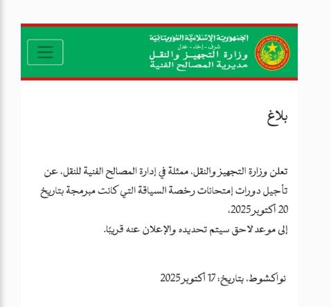 أعلنت وزارة التجهيز والنقل، ممثلة في إدارة المصالح الفنية للنقل، عن تأجيل دورات امتحانات رخصة السياقة التي كانت مبرمجة بتاريخ 20 أكتوبر 2025، إلى موعد لاحق سيتم تحديده والإعلان عنه قريبًا.