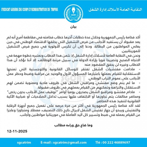 وثمّنت النقابة في بيان صادر عنها الخطاب الأخير للرئيس محمد ولد الشيخ الغزواني في مقاطعة أمرج، وما تضمّنه من تأكيد على أولوية تشغيل الموريتانيين، لافتة إلى أنه «خطوة مهمة في الاتجاه الصحيح وتصريحًا قويًا بإرادة الدولة في سبيل مرتنة الوظائف».