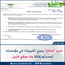 أجرى المدير العام للشركة الوطنية للاستصلاح الزراعي والأشغال "اسنات" خطري ولد العتيق تغييرات في إدارات ومصالح مؤسسته تصدرتها إقالة الإطار البارز بالشركة ومدير الأشغال السابق بها مولاي إبراهيم محمد...