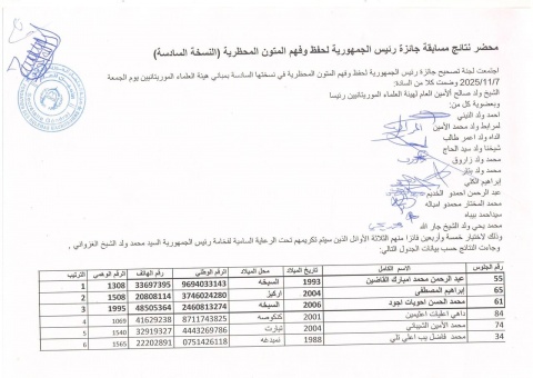 وأوضح المحضر أن لجنة الجائزة اجتمعت في السابع من نوفمبر الجاري بمقر هيئة العلماء الموريتانيين لاختيار الفائزين.