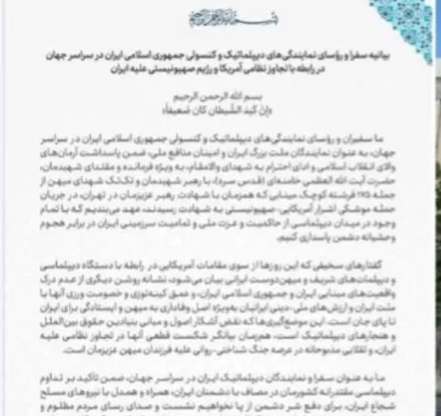 قال سفراء ورؤساء البعثات الدبلوماسية والقنصلية للجمهورية الإسلامية الإيرانية في مختلف أنحاء العالم إن ما وصفها بالتصريحات السخيفة التي تصدر هذه الأيام عن المسؤولين الأمريكيين بحق جهاز الدبلوماسية والدبلوماسيين الإيرانيين الشرفاء المحبّين لوطنهم، تعبر في الوقت ذاته عن هزيمتهم الحتمية في عدوانهم العسكري على إيران، وعن محاولة يائسة في ميدان الحرب الإدراكية والنفسية ضد أبناء وطننا العزيز.