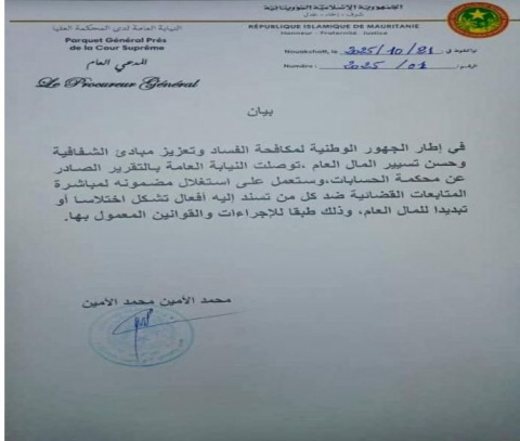في إطار الجهود الوطنية لمكافحة الفساد وتعزيز مبادئ الشفافية وحسن تسيير المال العام ،توصلت النيابة العامة بالتقرير الصادر عن محكمة الحسابات، وستعمل على استغلال مضمونه لمباشرة المتابعات القضائية ضد كل من تسند إليه أفعال تشكل اختلاسا أو تبديدا للمال العام، وذلك طبقا للإجراءات والقوانين المعمول بها.