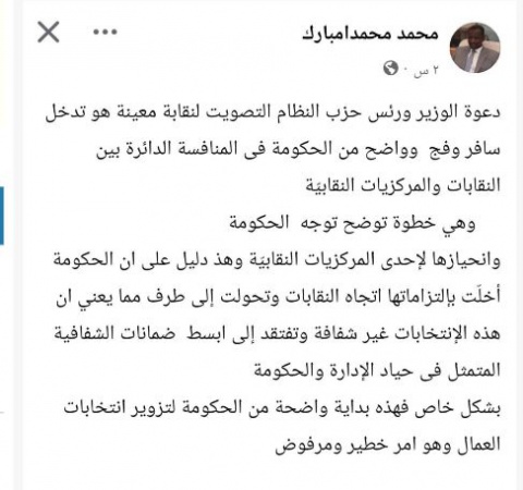 قال نائب رئيس حزب التجمع الوطني للإصلاح والتنمية "تواصل" النائب السابق محمد محمد امبارك إن دعوة من وصفه برئيس حزب النظام، في إشارة إلى حزب الإنصاف الحاكم للتصويت لنقابة عمالية معينة، تدخل فج من الحكومة، وبداية واضحة لتزوير انتخابات العمال.