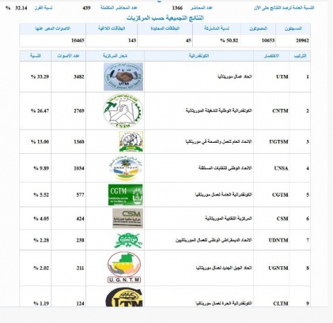 تصدر اتحاد عمال موريتانيا نتائج انتخابات التمثيلية النقابية بعد فرز32% من الأصوات، وذلك بحصوله على 3482 صوتا أي نسبة 33%.