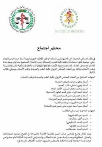 أعلن السلك الوطني لأطباء موريتانيا التوصل لاتفاق يقضي بتعليق طلاب كلية الطب لإضرابهم، بعد وساطة قام بها بين الطلاب وإدارة الكلية.